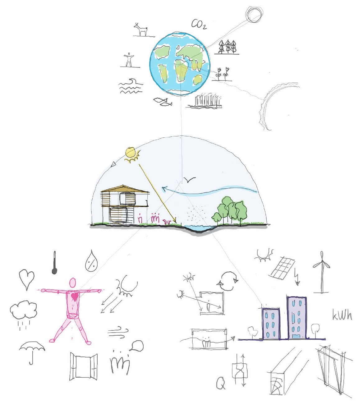 • intense vegetation providing solar and wind protection, visual comfort and space for food production in ‘urban style’ while reducing the urban heat island effect,