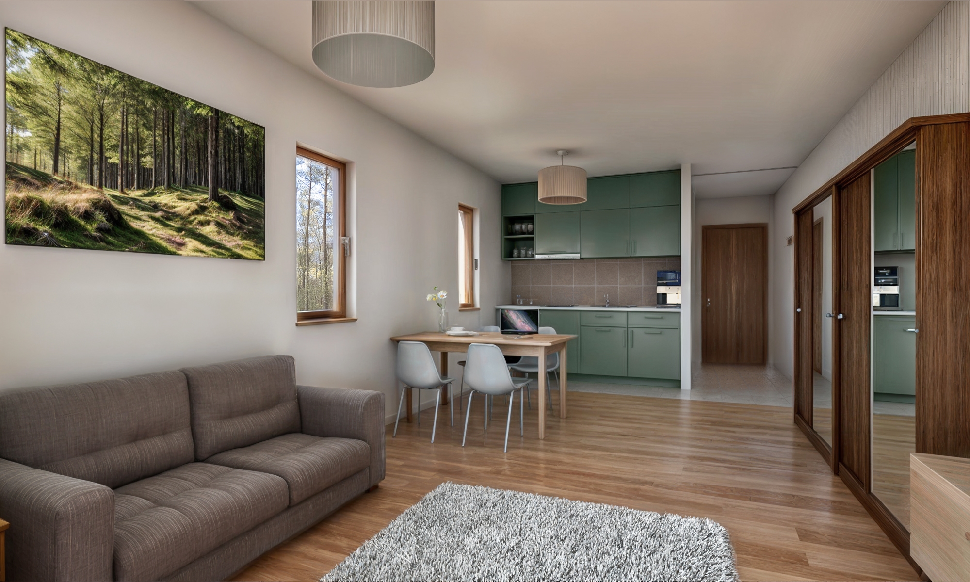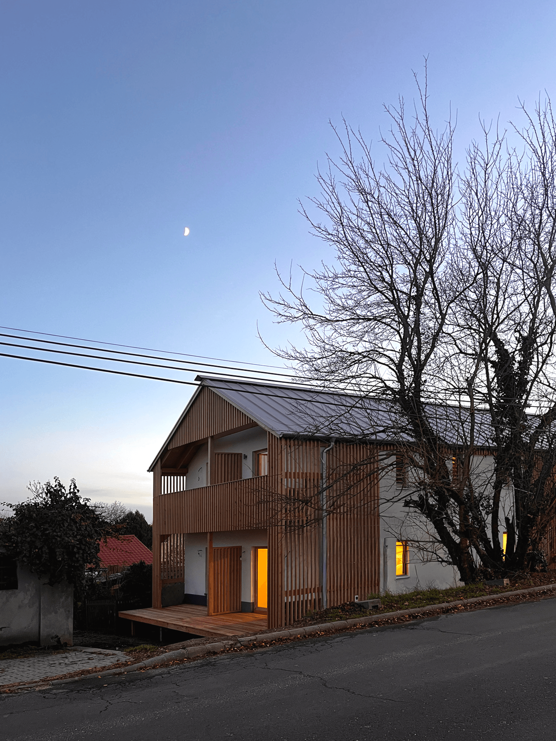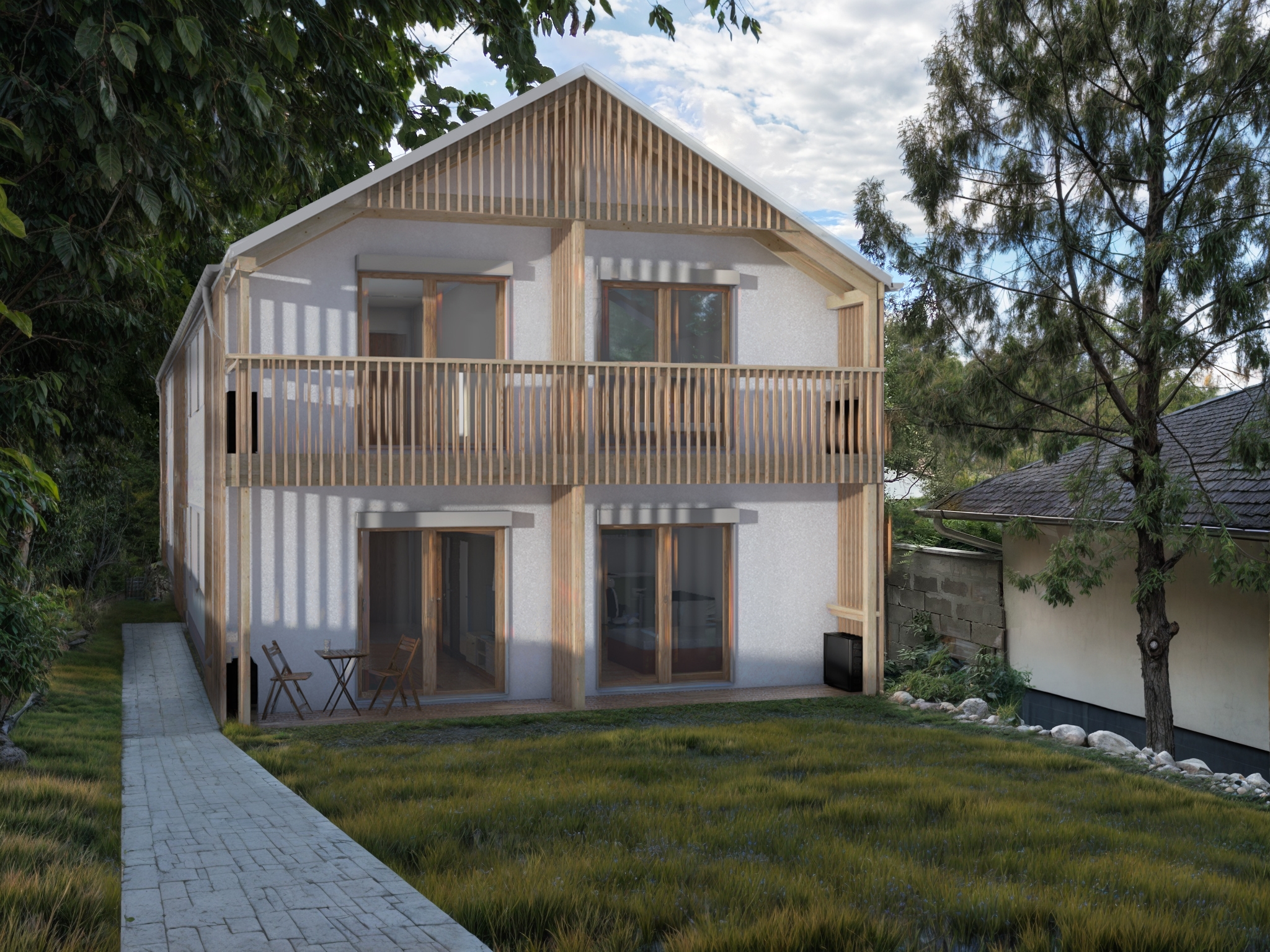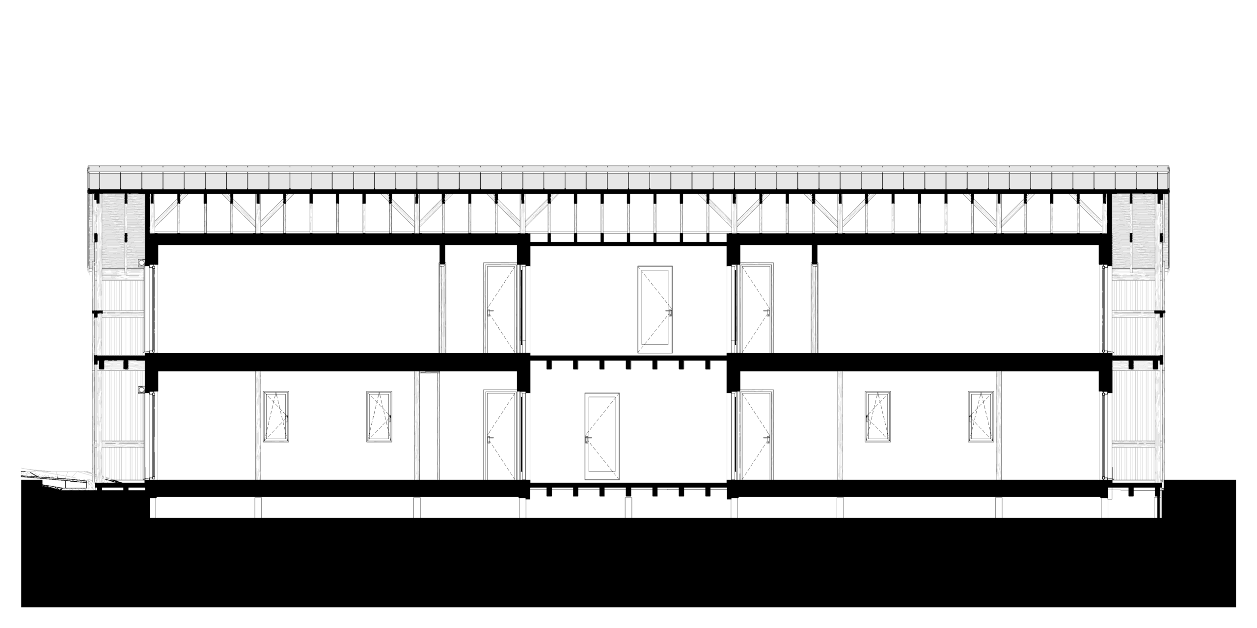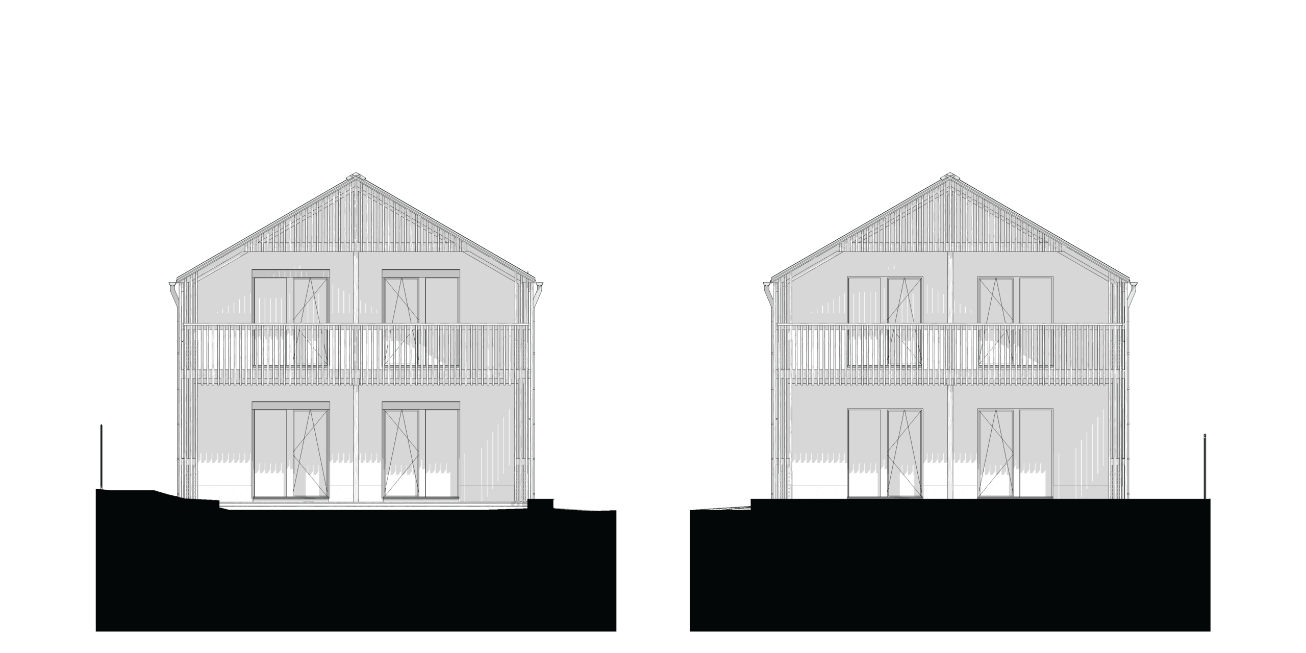 The primary load-bearing material was construction-grade timber, which was integrated into ribbed frames to create structural panels for load-bearing walls. Slabs and the roof were constructed in-situ using single ribs and beams. Cellulose was used as the main insulation material between the ribs. Steel earth-screws were used for the foundation. Facades were given extra insulation, and a warm white stucco screening complemented with pine lamellas for shading and added character.
