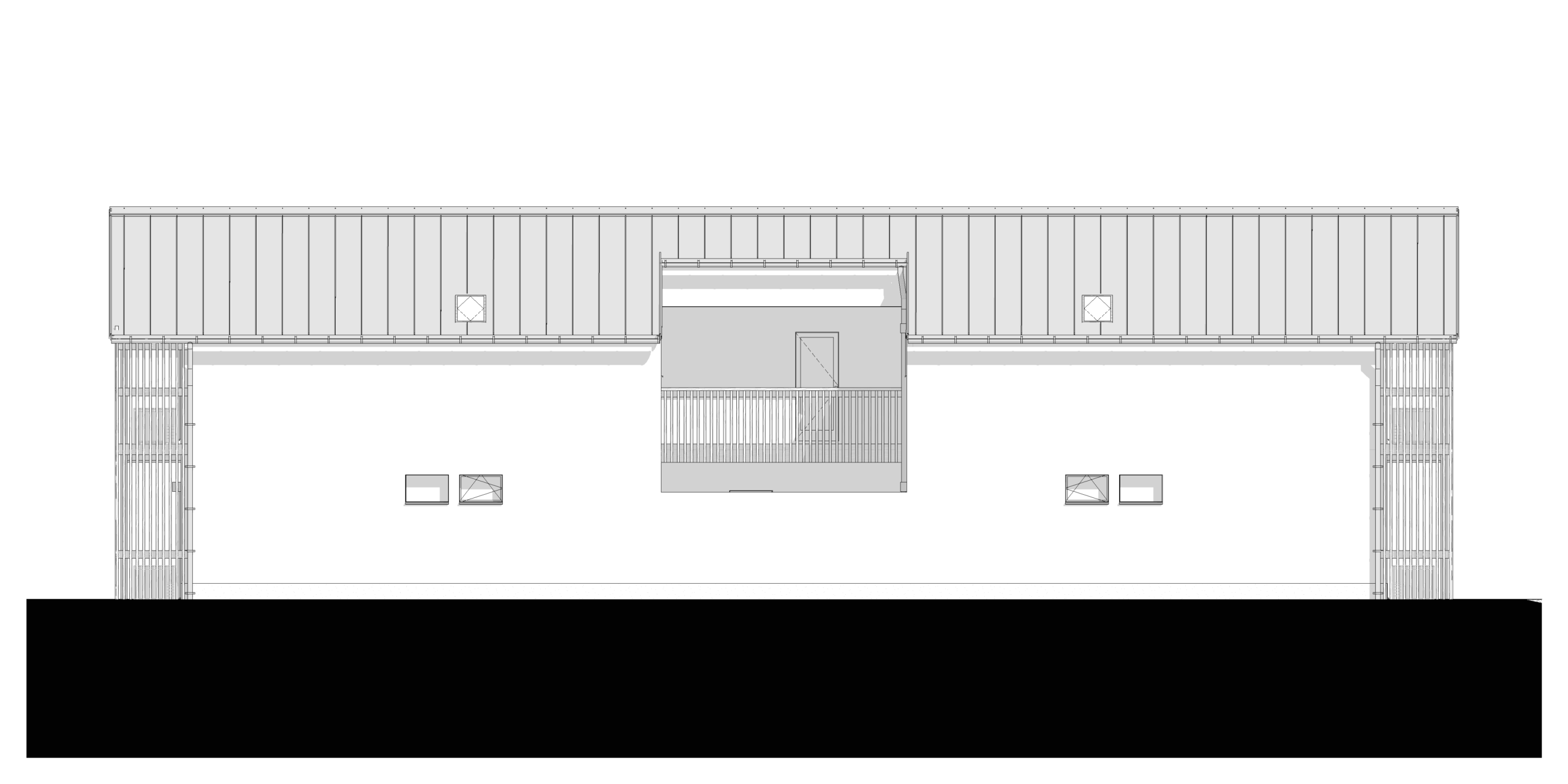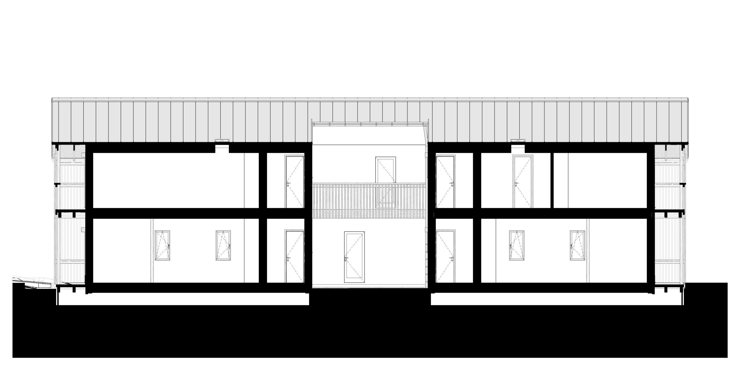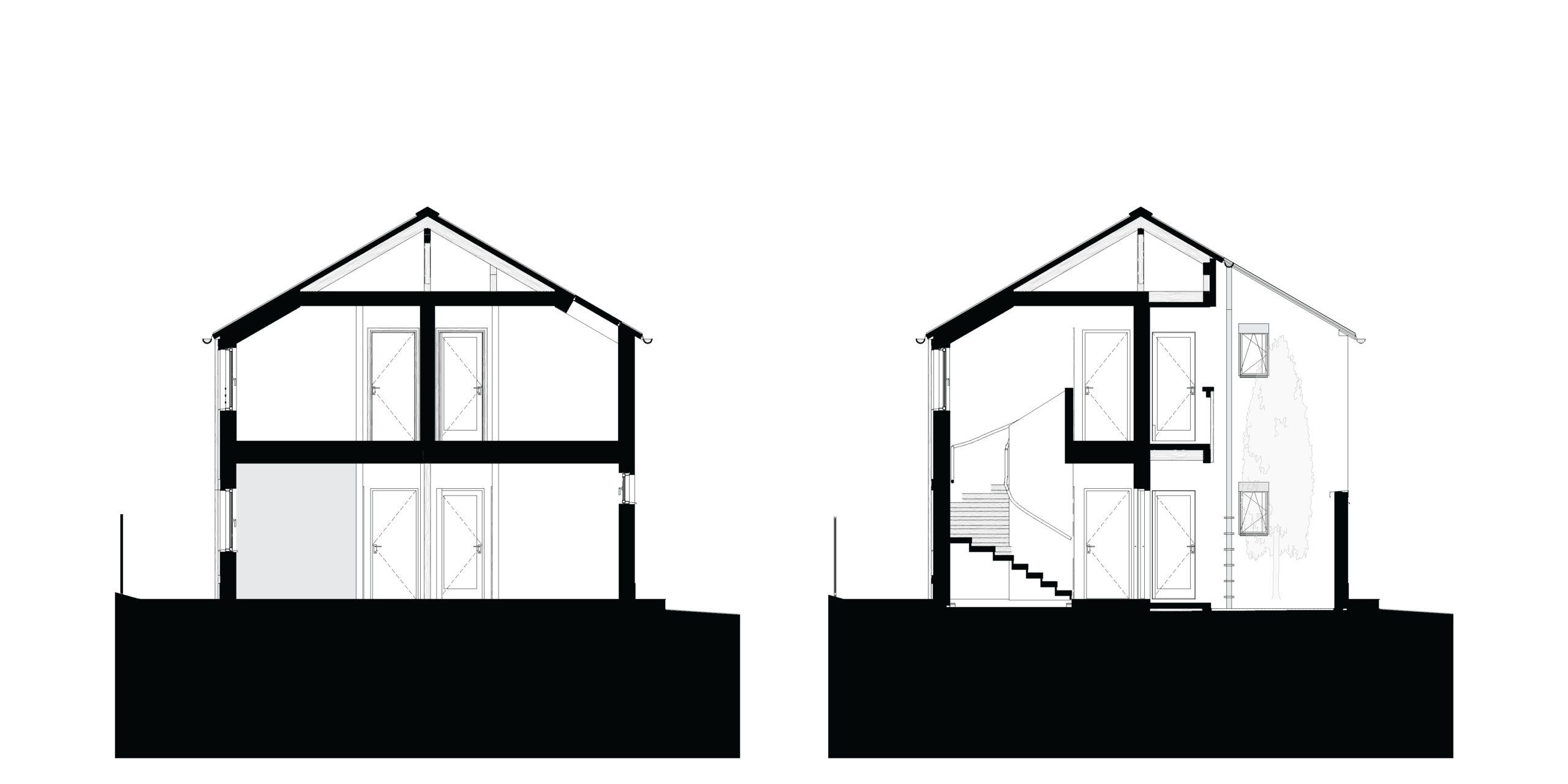 With the side garden so narrow, and a bus station just next to the fence, the house got its largest opening on the narrow facades, connecting the communal places, the office, and the rooms to two bigger patches of gardens. The entrance was placed in the middle of the long facade, where a small circulation area and technical zone open up to the livingroom, kitchen, and dining area complex, to the office on the other side, and to the rooms on the first floor. An atrium was opened in front of the entrance to allow for natural light to enter the smaller technical spaces.
